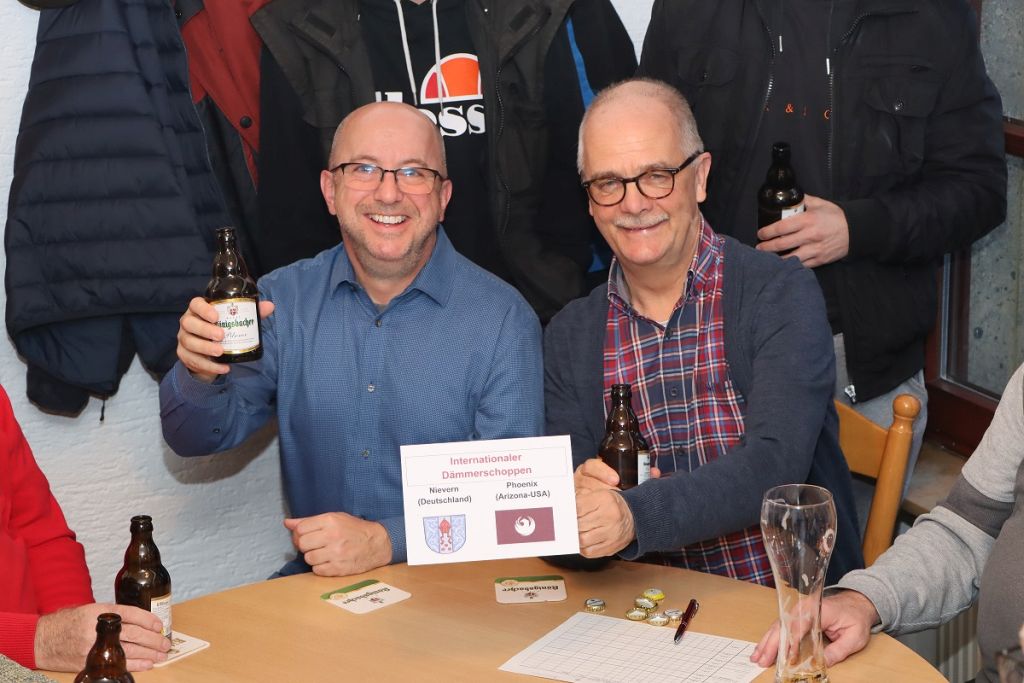 Erreichten uns erst kurz vor Weihnachten 2023 noch herzliche Grüße seines Nieverner Stammtischs im „Treffpunkt“, einer deutschen Kneipe in Phoenix (Arizona), überraschte „Hebbes“ Gerhard Kratzer die Freunde vom freitäglichen Dämmerschoppen im Bürgerhaus mit seinem Besuch. Tags zuvor aus familiärem Anlass gekommen, ließ er es sich nicht nehmen mal kurz vorbeizuschauen, um das Neueste aus seiner Heimatgemeinde zu erfahren und über einige Anekdoten aus Arizona zu berichten. Schnell war auch die Idee von einem Gegenbesuch in seiner Stammkneipe in Phoenix geboren, allerdings hält das Preisniveau für deutsches Bier im „Treffpunkt“ uns von einer aktuellen Umsetzung dieses Vorschlags (noch) etwas ab. Zumindest das Hinweisschild auf den „Internationalen Dämmerschoppen“ in Old Germany letzten Freitag wird – so unser „Hebbes“ – nach seiner Rückkehr schon mal einen Ehrenplatz auf dem Stammtisch im Treffpunkt erhalten.