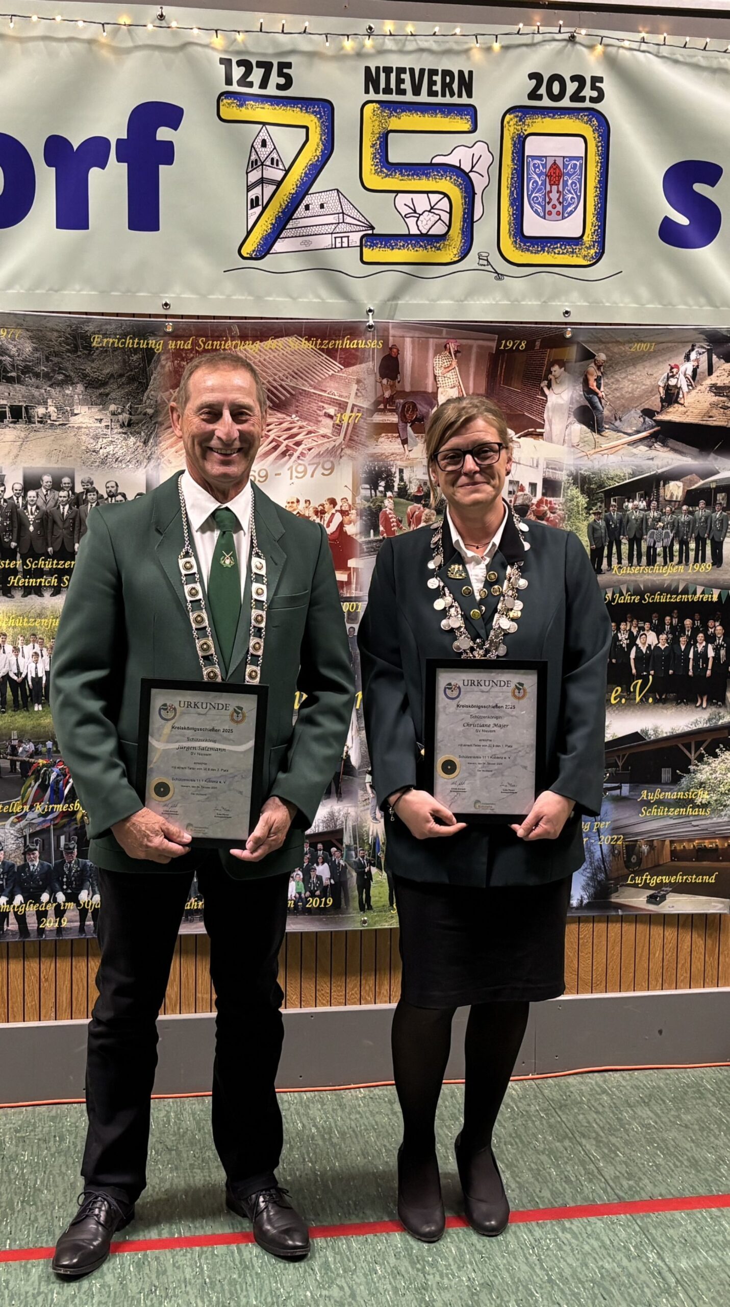 Es ist für jede Schützin oder jeden Schützen schon etwas Besonderes im Verein einmal die Königswürde zu erlangen. Wenn dies im Wettstreit mit anderen sogar auf der Kreisebene geschieht ist die Freude noch größer. Und sollte das – wie am vergangenen Samstag – auf der eigenen Schießsportanlage und dann noch im 750. Jubiläumsjahr der Ortsgemeinde gelingen, dürfte dies – so hoffen wir zumindest – zu einem unvergesslichen Erlebnis werden. So wurde Christine Majer vom Schützenverein „Auf der Eich“ Nievern Kreisschützenkönigin des Schützenkreises 111 Koblenz. Jürgen Salzmann belegte bei den Schützen Platz 2 hinter dem Kreisschützenkönig Marco Köhler vom Schützenverein Oberlahnstein. Jungschützenkönig auf Kreisebene wurde Sebastian Münch vom Schützenverein Koblenz-Asterstein. Alle Aktiven trafen sich im Anschluss zur Überreichung der Auszeichnungen, zu denen auch Erster Beigeordneter Peter Nörtershäuser im Namen der Ortsgemeinde gratulierte, in der Sporthalle, wo der Nieverner Schützenverein alles bestens vorbereitet hatte.