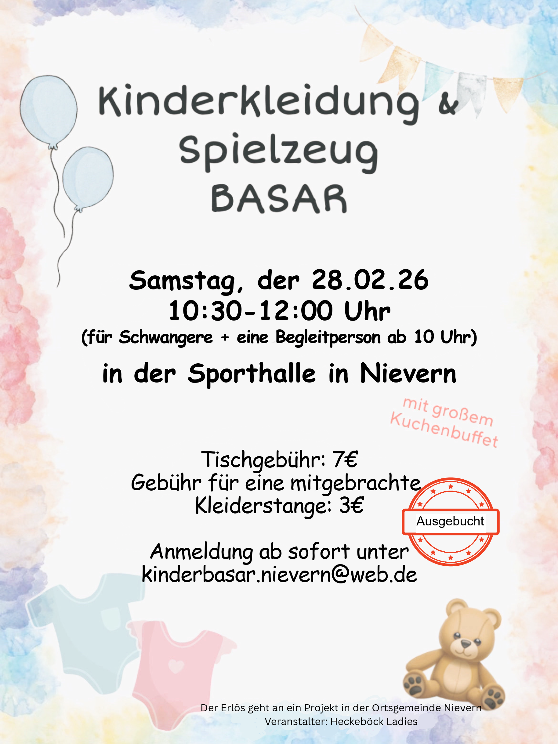 am Samstag, den 28. Februar 2026, findet wieder der Kinderkleidung & Spielzeug Basar in der Sporthalle Nievern statt! 🎉