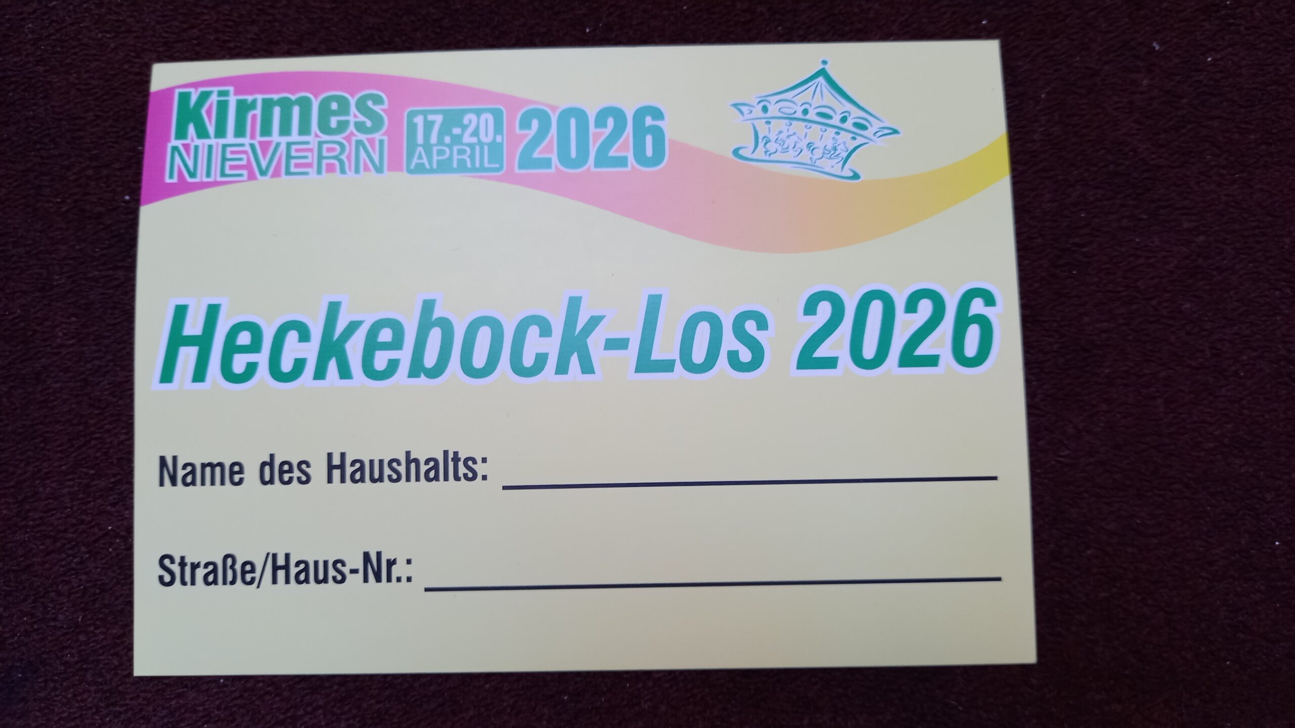 Dort sollte das Los, ausgefüllt mit dem Namen des Haushalts, der Straße und der Hausnummer, am Kirmessonntag, dem 19. April 2026 spätestens bis 16.00 Uhr in die dort aufgestellte Heckebock-Losbox eingeworfen werden.